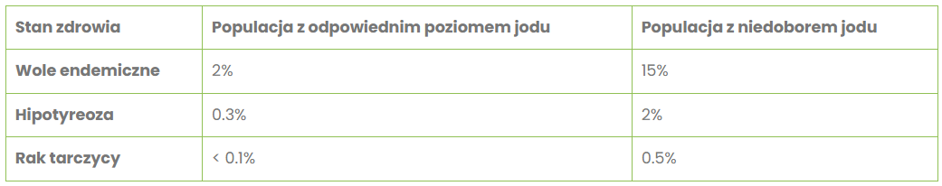 W celu zilustrowania wpływu niedoboru jodu na zdrowie, poniżej przedstawiono tabelę porównawczą, która uwzględnia różnice w występowaniu wybranych chorób tarczycy w populacjach z odpowiednim poziomem jodu i tych z jego niedoborem. Dane pokazują wyraźną korelację między niedoborem jodu a zwiększoną częstością występowania chorób tarczycy.