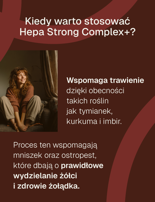 Zapomnij o uczuciu ciężkości po jedzeniu. Dzięki sile sylimaryny z ostropestu i karczocha, Twoja wątroba zyskuje moc do regeneracji, a Ty lekkość, której potrzebujesz na co dzień. To idealny wybór, jeśli chcesz zadbać o prawidłowy metabolizm tłuszczów i cukru, czy wesprzeć organizm w oczyszczaniu z toksyn po imprezie lub kuracji lekowej. Dodatek imbiru, kurkumy i mniszka sprawi, że Twój układ trawienny zacznie pracować jak zegarek, a Ty poczujesz przypływ energii i lepsze samopoczucie. Wybierając Hepa Strong, stawiasz na czysty skład i inteligentne połączenie ziół z nauką, by cieszyć się życiem bez dietetycznych wyrzutów sumienia.