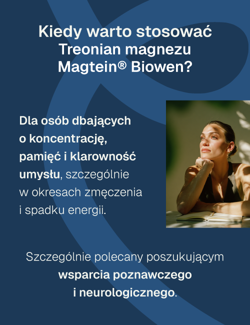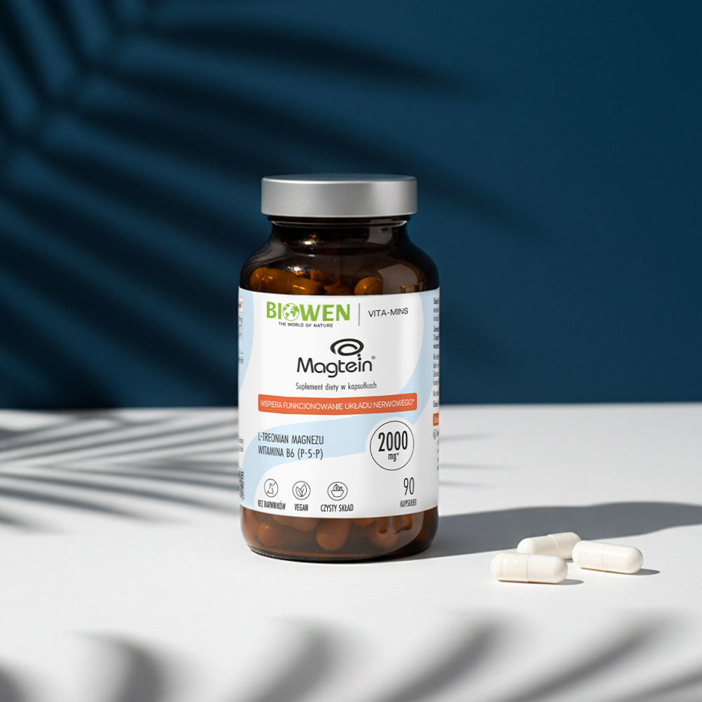 Cena jednostkowa zaTreonian magnezu Magtein® Biowen to suplement diety opracowany z myślą o osobach, które chcą świadomie wspierać funkcjonowanie układu nerwowego, koncentrację i codzienną równowagę psychofizyczną. Formuła łączy opatentowaną formę magnezu Magtein® z aktywną witaminą B6 (P-5-P), tworząc kompleks wpisujący się w nowoczesne podejście do suplementacji.