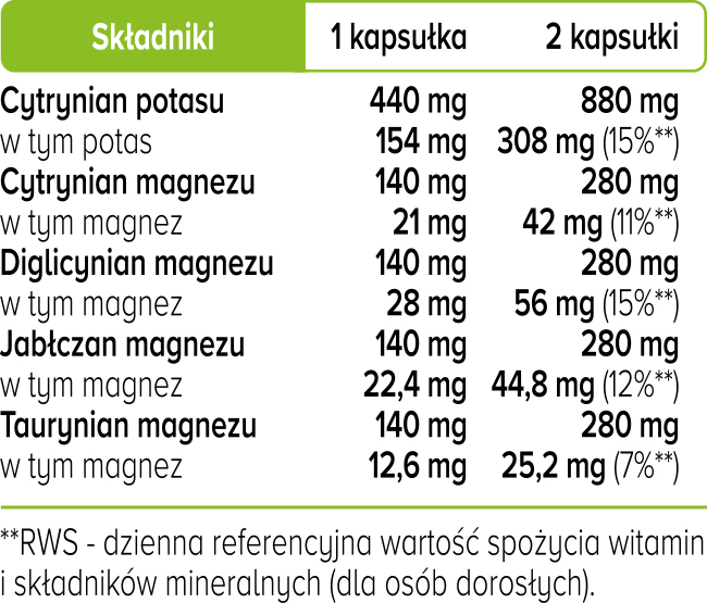 Składniki: cytrynian potasu, cytrynian magnezu, diglicynian magnezu, jabłczan magnezu, taurynian magnezu, otoczka kapsułki: hydroksypropylometyloceluloza.